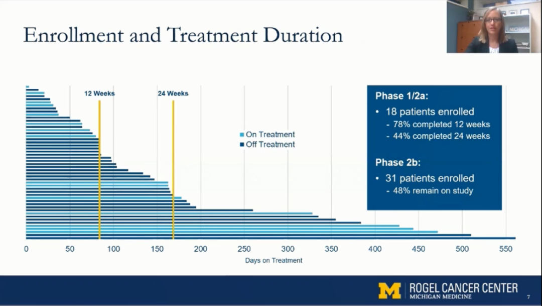 IIb期共纳入31例患者。除1名患者外,其他所有患者先前都接受过芦可替尼治疗;65%的人接受了多达4种额外的治疗,包括fedratinib和CPI-0610。37%的患者在基线时依赖输血。62%为IPSS高风险,其余为中风险。中位治疗时间为110(21-561)天。