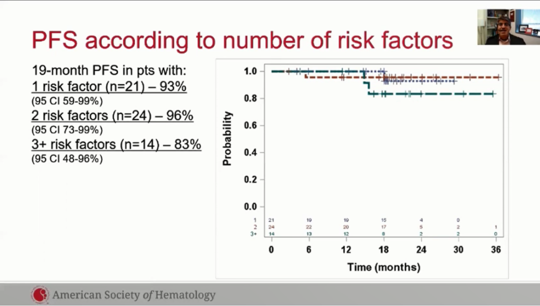 有效性方面:6例患者在HCT后基线时未达到CR(均为PR)。5例患者在研究治疗后转换为CR,1例患者保持PR而无PD。仅发生2例PFS事件,1例患者在15个月时复发,预防治疗后自行停药后发生PJP相关死亡。所有纳入评估患者的预估18个月PFS和OS分别为95%和98%。伴有2中或者3中以上风险因素患者的18个月PFS估计值分别为92%和89%。
