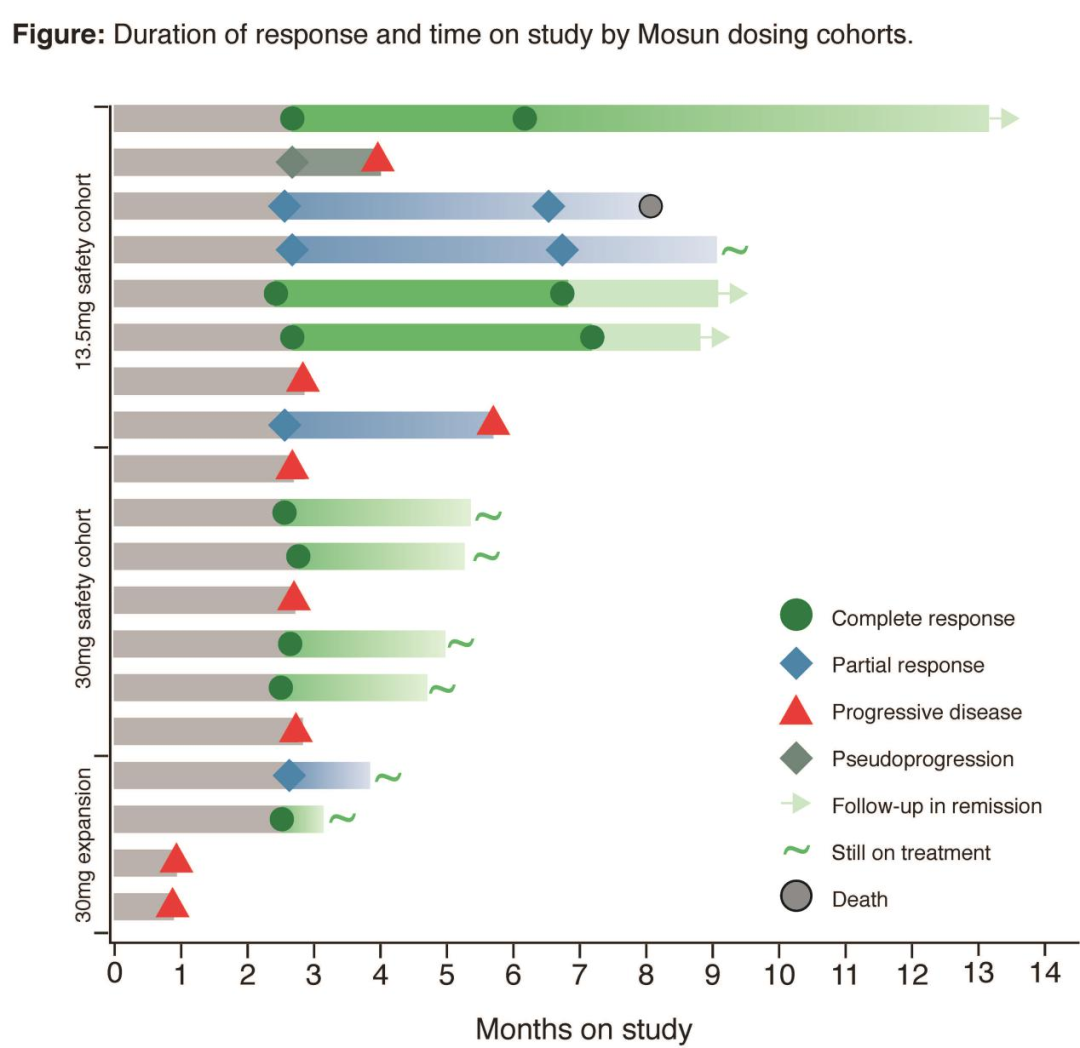 截至2020年5月27日,队列B的19例患者接受了Mosun(1 mg[C1 D1]/2 mg[C1 D8]/13.5 mg[C1 D15以后],n=8;1/2/30 mg,n=11)。8例患者入组13.5 mg安全性评价队列,11例患者入组30 mg安全性队列和扩展队列(分别为7+4)在Mosun剂量13.5 mg时,3/8例患者(38%)在PRA时达到CR,2例(25%)达到PR,3例(38%)达到PD。在Mosun剂量30 mg下,IRA时可获得缓解:5/11例患者(45.5%)达到CR,1例(9%)达到PR,5例(45.5%)达到PD。在8例PD患者中(来自两个剂量队列),5例在进展后接受了挽救治疗。