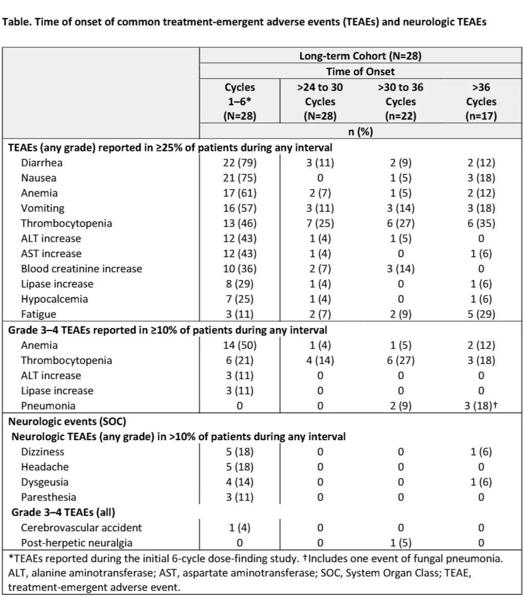 在fedratinib治疗>24个周期后,最常见的TEAEs为血液学和胃肠道(GI)事件,其发生率低于或与早期治疗周期相似。第24周期后 > 1例患者报告的3-4级TEAEs为血小板减少、贫血、中性粒细胞减少和肺炎。很唯一关注的心脏事件为第7周期发生的1例充血性心力衰竭(1级)。第24周期后在 > 1例患者中观察到的唯一感染事件为肺炎;在4例患者报告的5起事件中,所有事件均为3级或4级,2起事件被认为可能与治疗相关。在任何时间报告3例3-4级严重神经系统事件:带状疱疹后神经痛(2例患者,周期10和周期36)和脑血管意外(1例患者,周期1)。