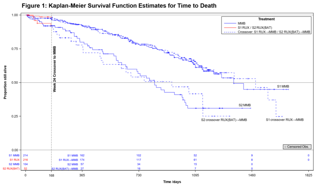 在S1和S2中,治疗组之间的OS和LFS相似(S1中OS的分层HR为0.99,S2中为0.96),表明开始JAKi治疗的MMB患者和最初接受RUX/BAT治疗随后接受MMB的患者的生存结局稳健且一致(图1)。此外,S2组的中位OS(MMB组为34.3个月)与既往报告的RUX停药患者的中位生存期(13-30个月)相比非常有利(Tang,ASH 2019)。在S1中,MMB组26.5%的患者和RUX组29.5%的患者达到脾脏缓解,定义为第24周时脾脏体积较基线减少≥35%(非劣效性p<0.001)。在ET阶段,使用研究前脾脏大小作为基线,共观察到35例新的缓解,包括22例RUX→MMB受试者的缓解。总体而言,在S1中随机接受MMB的患者中,40%在研究期间的任何时间达到脾脏缓解。在S1和S2的ET期间均观察到稳健的脾脏反应持续时间。