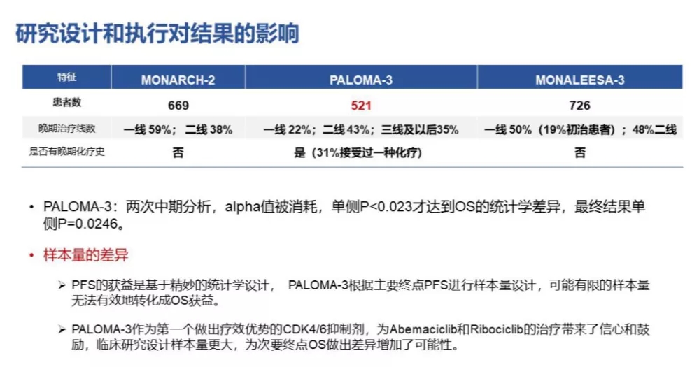 当一研究在主要终点未出现统计学差异时,仅仅表示我们无法拒绝原先设定的原假设而接受备择假设,并不能否定原假设;即在PALOMA-3研究中,我们所得的结论为哌柏西利对于晚期乳腺癌的OS获益不明确,而不是无获益。对于统计学检验的阳性结果和阴性结果影响因素较多;具体到PALOMA-3研究,由于两次中期分析消耗了I类错误的α值,在最终分析时,需要单侧P<0.023才有OS的统计学差异,而实际的单侧P=0.0246,差距极小。在PALOMA-3研究、MONARCH-2研究和MONALEESA-3研究三大研究中,POLAMA-3样本量最小,在中期分析对α值的消耗下,可能由于样本量过低导致了最终的统计学阴性结果(图2)。