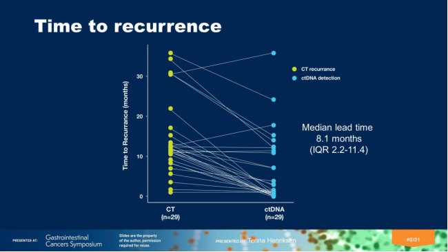 目前结直肠癌治疗的主要挑战是尽早地发现复发,以及确定术后和辅助治疗后的复发高危患者。术后ctDNA的分析是一种检测微小残留病灶(MRD)和高复发风险的很有前途的方法。Abstract 11是一项前瞻性多中心研究,旨在评估术后ctDNA分析是否能够鉴别出高复发风险患者评估辅助治疗的疗效,并评估其对比影像学是否能够更早地发现复发。本队列纳入了265例Ⅰ~Ⅲ期的结直肠癌患者,是迄今为止评估ctDNA检测有效性的最大的研究队列。