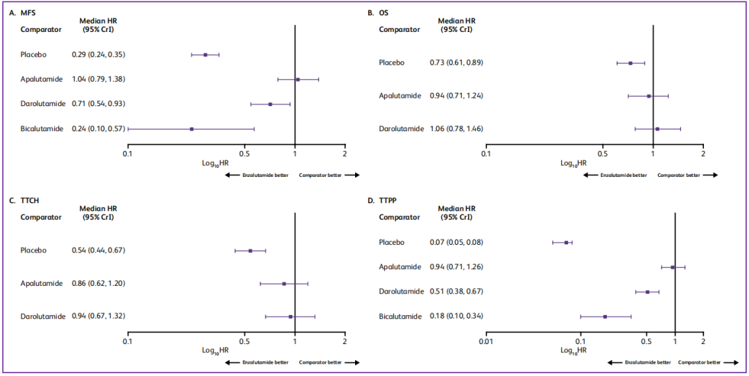 图1. 网络Meta分析:恩扎卢胺对比安慰剂、阿帕他胺、达罗鲁他胺、比卡鲁胺的MFS、OS、TTCH、TTPP中位HR