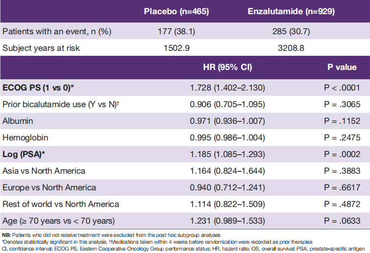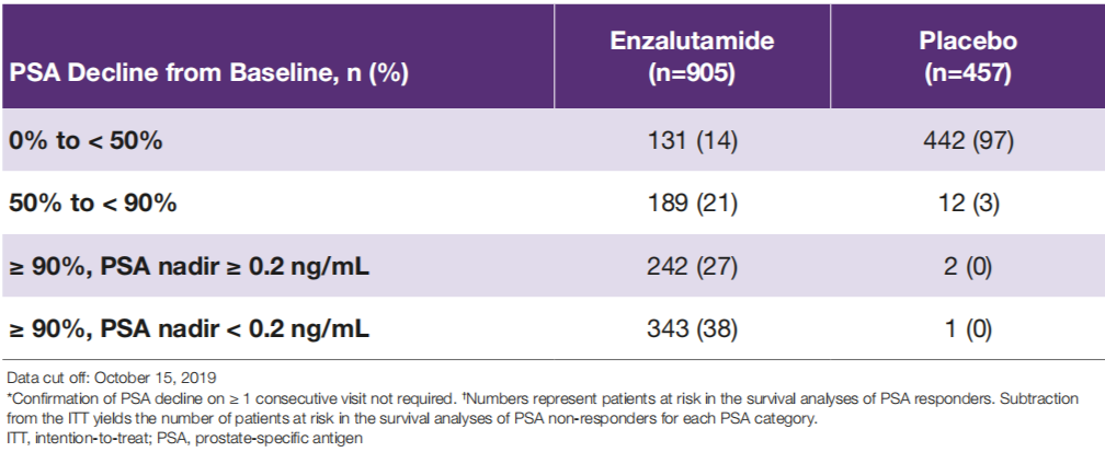 [1]PROSPER subgroup analysis by age and region: Overall survival and safety in men with nonmetastatic castration resistant prostate cancer receiving androgen deprivation therapy plus enzalutamide.ASCO GU 2021, Abstract 84[2]Overall survival (OS) and metastasis-free survival (MFS) by depth of prostate-specific antigen (PSA) decline in the phase III PROSPER trial of men with nonmetastatic castration-resistant prostate cancer (nmCRPC) treated with enzalutamide (ENZA).ASCO GU 2021, Abstract 94[3]Network meta-analysis (NMA) comparing the efficacy of enzalutamide versus apalutamide, darolutamide, and bicalutamide for treatment of nonmetastatic (nm) castration-resistant prostate cancer (CRPC).ASCO GU 2021, Abstract 101[4]Hussain M, Fizazi K, Saad F, et al. N Engl J Med. 2018;378(26):2465-2474.[5]Sternberg CN, Fizazi K, Saad F, et al. N Engl J Med. 2020;382(23):2197-2206.[6]Kumar et al. Urol. Oncol., 2020[7]Liu et al. Am J Clin Oncol, 2020, 43: 288-297.