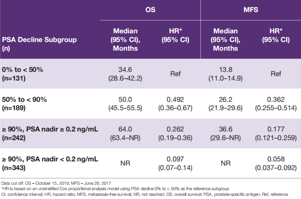 表3. 不同PSA下降程度的患者OS和MFS