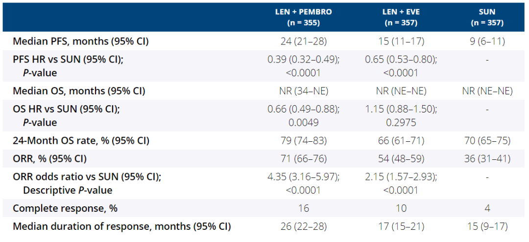 • 相较于SUN组,LEN+PEMBRO组(71% vs 16%;OR 4.35,95%CI:3.16~5.97)和LEN+EVE组(54% vs 16%;OR 2.15,95%CI:1.57~2.93)的ORR均有显著提高。LEN+PEMBRO组、LEN+EVE组、SUN组的CR率分别为16%、10%和4%。