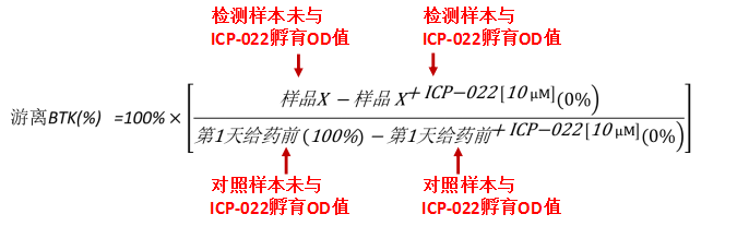 2、兔抗BTK一抗与上述样品孵育将会与BTK结合,四甲基联苯胺(TMB)是抗兔二抗耦联的HRP 的底物,通过硫酸终止该反应,经显色后在450 nm波长下测定吸光值,620 nm可以作背景校正,游离BTK的含量与吸光值成正比,由此可以计算出游离BTK的含量(具体计算方法如下图),BTK占有率=100%-游离BTK(%)。