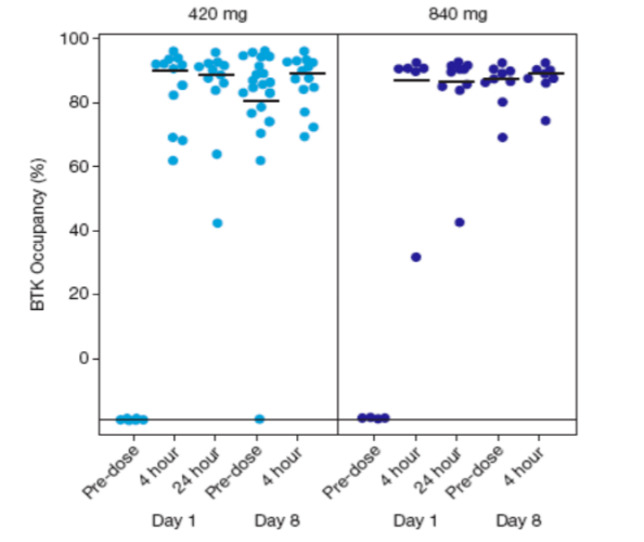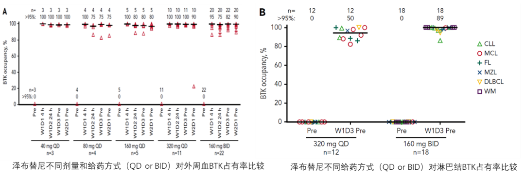 国内第二个上市的BTK抑制剂是泽布替尼,获批剂量为160mg 每日两次(BID),泽布替尼治疗B细胞恶性肿瘤的1期研究,对45例复发/难治性淋巴瘤患者进行了PBMC的BTK占有率检测,在推荐剂量160mg BID组中位BTK占有率>95%【4】。同样在这项研究中,取30例复发/难治性淋巴瘤患者的淋巴结活检标本,检测泽布替尼160mg BID 和 320mg QD两种给药方式对BTK靶点的抑制,结果显示产生完全BTK靶点抑制(>95%)的患者比例分别为89% vs 50%, P=0.0342, 所以泽布替尼后续的研究都选用160mg BID给药方式。