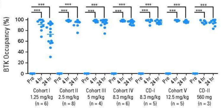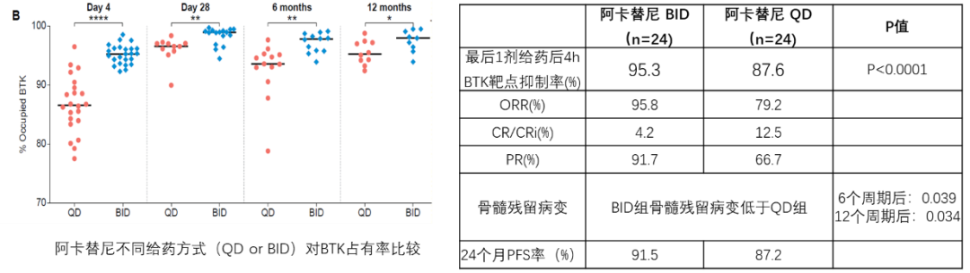 全球第二个上市的BTK抑制剂是阿卡替尼,获批剂量为100mg 每日两次(BID)。阿卡替尼治疗CLL患者的一项2期临床试验,对48例复发/难治或高危初治的CLL患者进行了PBMC的BTK占有率检测,并评估了阿卡替尼100mg每日两次(BID)或200mg每日一次(QD)治疗CLL的安全性、疗效和药效学,研究结果显示,BID组和QD组给药后4小时外周血单核细胞的BTK占有率分别为95.3%和87.6%,P<0.0001,ORR分别是95.8%和79.2%,2年PFS率分别为91.5%和87.2%【3】,表明与QD组相比,BID组的BTK占有率更高,对相关通路的抑制性更强,疗效更佳。该研究侧面反映BTK靶点占有率越高,BTK抑制剂的疗效可能越好。