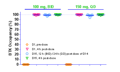 刘澎教授:奥布替尼是国内第三个上市的新型BTK抑制剂,获批剂量为150mg 每日一次(QD)。奥布替尼治疗复发/难治性MCL患者的多中心II期研究,对100mg BID组 和150mg QD组15例患者进行了PBMC的BTK占有率检测,结果显示奥布替尼100mg BID 和150mg QD 两个剂量组均能达到接近100%的靶点占有率,并且给药后4-24小时BTK占有率并未降低,且受试者间的差异很小。可见两种给药方式下奥布替尼对复发难治套细胞淋巴瘤患者PBMC均可持续24小时完全占有BTK(>99.6%)【5】,疗效和安全性评估两组相当,考虑到奥布替尼150mg 每日一次用药能给患者带来更好的便利性和依从性,因此临床推荐150mg每日1次作为其给药方式。