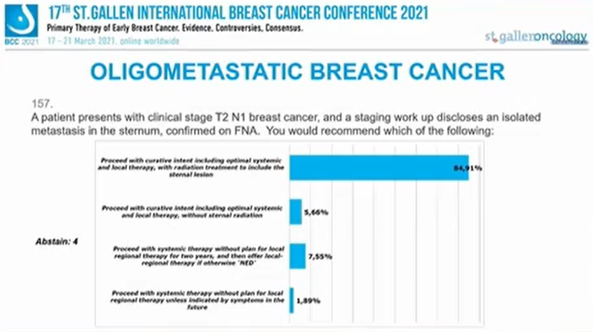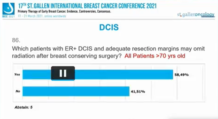 编者按:当地时间3月21日,在Eric Winer教授的主持下,第十七届圣加伦国际乳腺癌大会(SG-BCC 2021)的专家完场了第二场投票,本文总结“乳腺导管原位癌(DCIS)”、“乳腺癌寡转移”、“新冠与乳腺癌治疗”的专家投票结果。