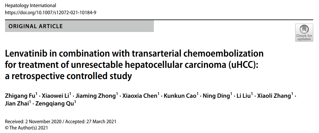 参考文献:Fu ZG, Li XW, Zhong JM, et al. Lenvatinib in combination with transarterial chemoembolization for treatment of unresectable hepatocellular carcinoma (uHCC): a retrospective controlled study. Hepatol Int. 2021 Apr 20.