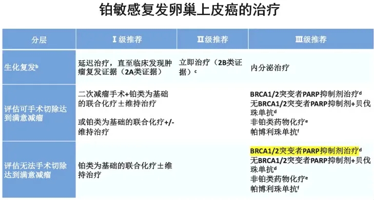 铂敏感复发卵巢上皮癌治疗的III级推荐中,BRCA1/2突变携带者的治疗选择中新增氟唑帕利。