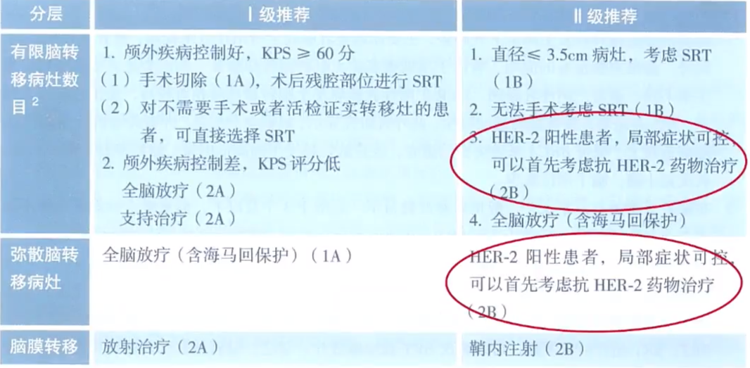 对于不同的脑转移患者(有限脑转移病灶数目、弥散脑转移病灶、脑膜转移),治疗推荐如下:
