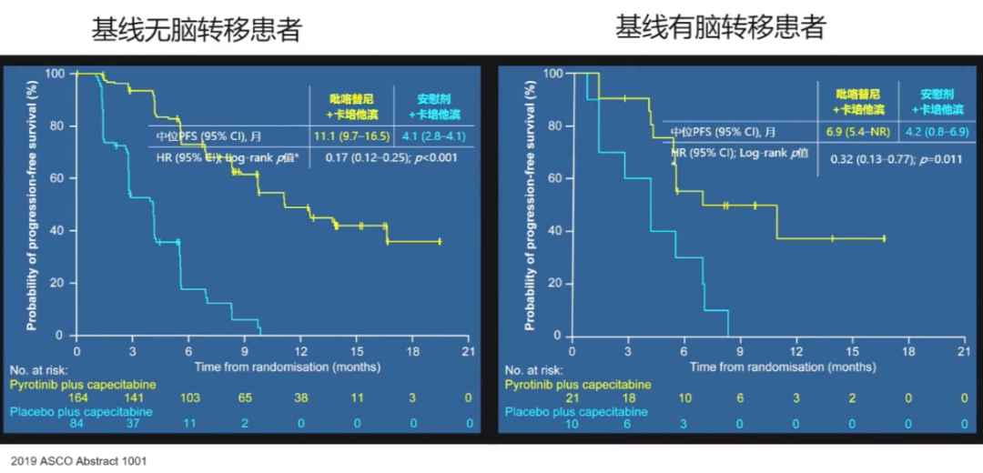 我国自主研发的TKI药物吡咯替尼的Ⅲ期临床研究中(PHENIX研究),也纳入了部分脑转移患者,结果显示,对于基线有脑转移的患者,吡咯替尼+卡培他滨使患者PFS的明显延长。进一步研究发现,在无脑转移史的患者中:吡咯替尼+卡培他滨组出现的新发脑转移的患者比例更低 (1.2% vs 3.6%),吡咯替尼+卡培他滨组治疗后至新发脑转移的出现时间更长(397.5 vs 132.0天)。对于基线存在未治疗脑转移的患者:吡咯替尼+卡培他滨组存在脑转移进展的患者比例更低(73.3% vs 87.5%),吡咯替尼+卡培他滨组治疗后至脑转移进展的时间更长(168.0 vs 127.0天)。