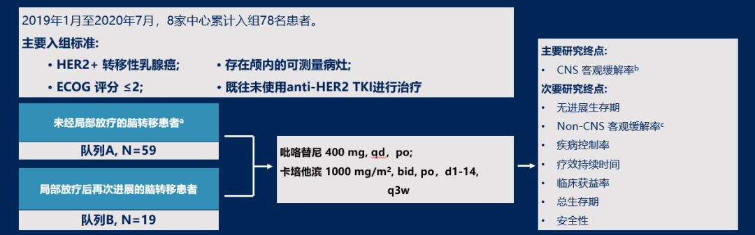 方法:为了探讨吡咯替尼在HER2阳性乳腺癌脑转移患者中的疗效和安全性,这项单臂、前瞻、开放标签的多中心Ⅱ期试验,入组患者为HER2阳性转移性乳腺癌,存在颅内的可测量病灶,ECOG 评分≤2,既往未使用抗HER2 TKI治疗。其中队列A为未经局部放疗的脑转移患者,队列B为局部放疗后再次进展的脑转移患者。患者接受吡咯替尼(400 mg,qd,po)联合卡培他滨(1000mg/m2, bid,po,d1-14,q3w)治疗。研究的主要终点为CNS客观缓解率(CNS ORR);次要终点包括无进展生存期(PFS)、Non-CNS ORR、疾病控制率(DCR)、疗效持续时间(DoR)、临床获益率(CBR)、总生存期(OS)和安全性。