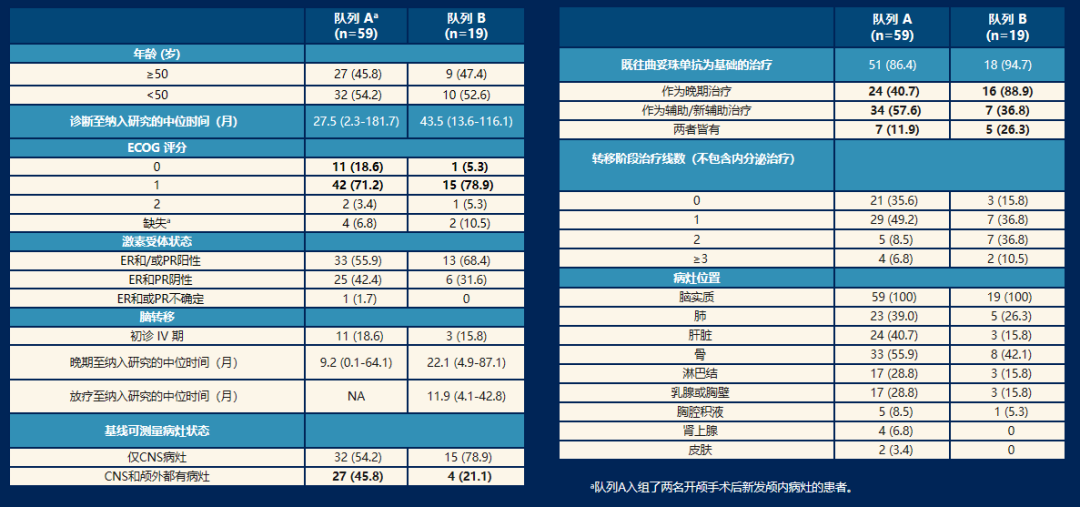 队列A共入组59例新发脑转移患者,队列B共入组19例脑转移放疗后进展患者,对这两部分患者的疗效进行独立评估。所有患者均有颅内可测量病灶,其中31例患者(A队列27例、B队列4例)有颅外可测量病灶。