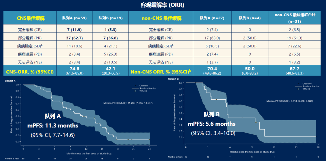 在次要终点方面:两个队列患者的Non-CNS ORR为67.7%(95%CI:48.6~83.3)。队列A和队列B的中位PFS分别为11.3个月(95% CI:7.7~14.6)和5.6个月(95% CI:3.4~10.0)