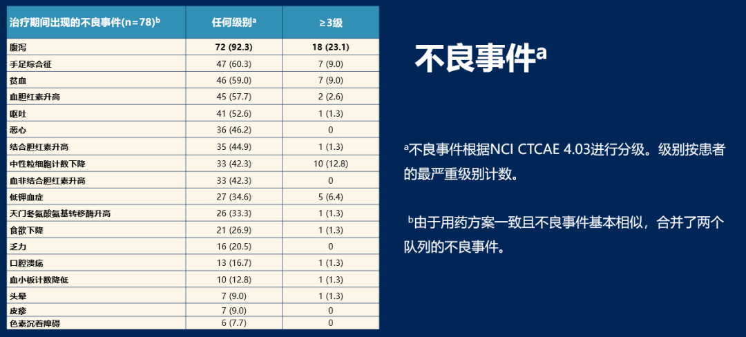 在安全性方面:由于用药方案一致且不良事件基本相似,合并两个队列分析,没有发现新的不良事件。其中常见的治疗期间出现的不良事件(TEAEs)为腹泻(92.3%)、手足综合征(60.3%)、贫血(59.0%)、血胆红素升高(57.7%)、呕吐(52.6%)等;常见的≥3级TEAEs为腹泻(23.1%)、中性粒细胞计数下降(12.8%)、手足综合征(9.0%)、贫血(9.0%)等。