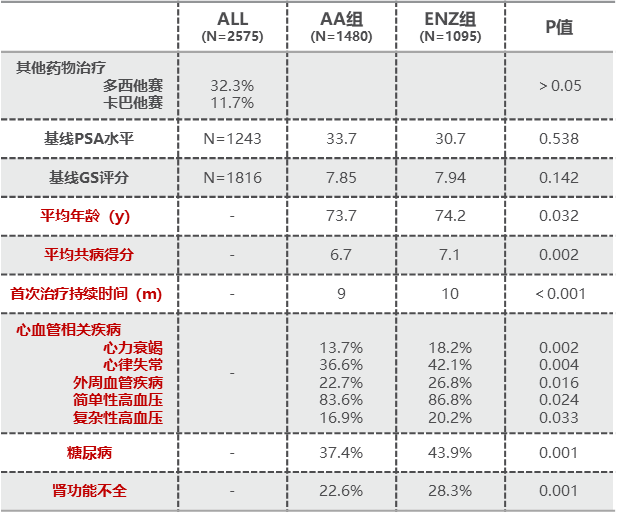 壁报5032的真实世界研究1纳入了5895名阿比特龙或恩扎卢胺经治的mCRPC患者以探究恩扎卢胺和阿比特龙在生存期上的差异。下表为这些患者的基线情况,可见恩扎卢胺组患者更高龄,共病更多。