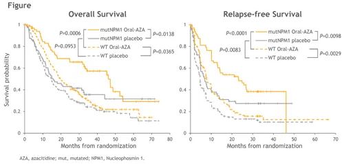 Oral-AZA可显著延长初发AML和细胞遗传学中风险患者的生存期。此外,在QUAZAR AML-001试验中,oral-AZA组与安慰剂组相比,所有患者的中位OS延长了9.9个月,其中NPM1突变患者亚组的中位OS延长超过2.5年。这表明NPM1突变在一般情况下是预后的有利因素,并且是Oral-AZA延长OS的独立预测因素。