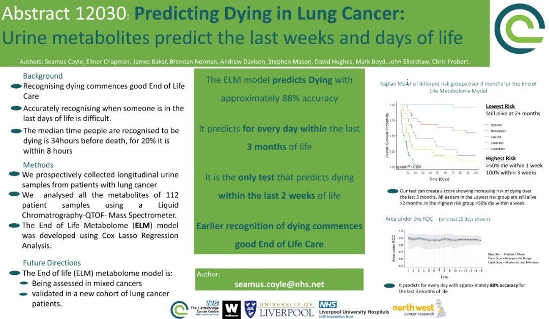 Seamus Coyle, et al. Predicting dying from lung cancer: Urine metabolites predict the last weeks and days of life. American Society of Clinical Oncology Annual Meeting: Abstract 12030. Presented June 4.