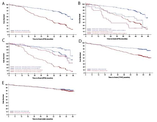 【研究结果】本研究共有432例患者入组,各有216例患者随机接受Ven-Obi或Clb-Obi治疗。中位随访52.4个月(49.5-56.2)时,Ven-Obi组患者的PFS仍然显著优于Clb-Obi组(未达到 vs 36.4个月,p<0.0001,图A)。随机分组后4年时,Ven-Obi组的预计无进展生存(PFS)率为74%;Clb-Obi组仅为35.4%。