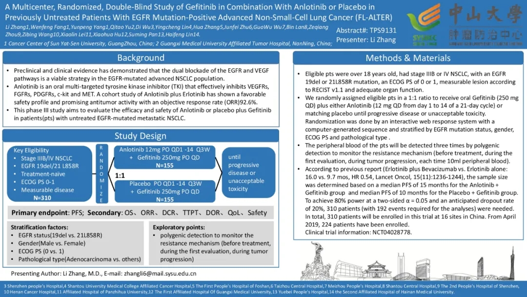 【Abstract #: TPS9131】吉非替尼联合安罗替尼或安慰剂治疗既往未经治EGFR突变阳性的晚期非小细胞癌的多中心、随机、双盲研究(FL-ALTER)
