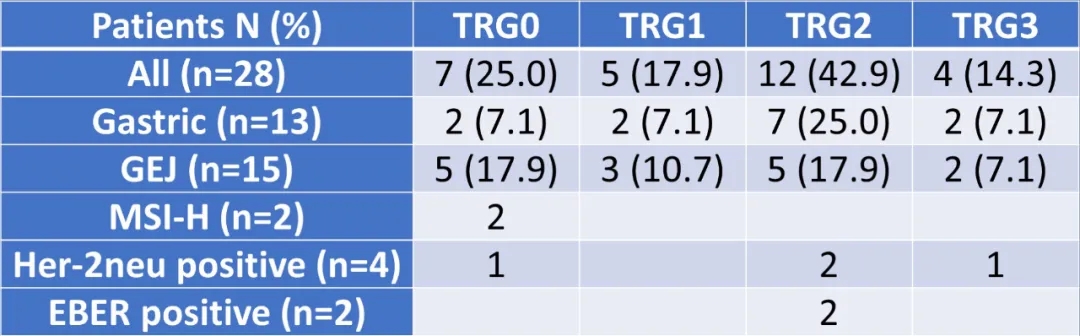 来自天津医科大学肿瘤医院的Gastrimm-001研究是一项由研究者发起的单臂Ⅱ期临床研究,旨在探索特瑞普利单抗联合FLOT方案围手术期治疗可切除的胃及胃食管结合部腺癌的主要病理缓解率及3年无病生存率。研究对36例可切除的进展期(>T2或N+)胃癌或胃食管结合部腺癌,术前给予4周期特瑞普利联合FLOT方案化疗,术后再给4周前特瑞普利联合FLOT方案化疗。入组患者的平均年龄60岁,其中T3/T4患者占91.7%,N+患者占88.9%(表1)。术前术后分别给予4周前特瑞普利联合FLOT方案(每一周期化疗前给予特瑞普利单抗240 mg,d1;多西他赛50mg/m2,d1;氟尿嘧啶2600 mg/m2,d1,持续泵入24小时;亚叶酸钙200 mg/m2,d1;奥沙利铂85 mg/m2,d1)。主要研究终点包括主要病理缓解率(MPR)及3年无病生存率(DFS),次要终点包括病理完全缓解率、安全性、有效率、3年及5年生存率。至2021年2月共有36例患者入组,其中2例患者治疗后拒绝手术治疗,6例患者尚未完成术前治疗。28例完成手术的患者术后病理显示有7例达到完全病理缓解(TRG1a),5例接近完全病理缓解(TRG1b),主要病理缓解率42.9%(表2)。常见不良事件包括厌食、恶心、乏力贫血等,其中3级以上的不良事件中性粒细胞减少(30.6%)、白细胞减少(25.0%)及贫血(5.6%)等(表3)。研究结果初步显示FLOT方案联合特瑞普利单抗围手术期治疗可切除的胃或胃食管结合部腺癌进一步提高了病理缓解率及主要病理缓解率,为进一步提高无病生存奠定了基础。联合方案并没有明显增加不良反应及手术并发症。