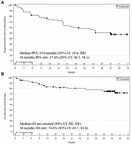 截止至2020年8月,中位随访时间为35.3个月(范围0.3-41.6个月),45.3%的患者仍在继续服用泽布替尼治疗,54.7%的患者因PD(43.0%)或不良反应(9.3%)终止了治疗。ORR为83.7%,67例患者(77.9%)达到了CR。中位DOR尚未达到,30个月时57.3%(95%CI,44.9-67.9)的患者处于无事件(PD/死亡)生存。中位PFS为33.0个月(图A);疗效在各种亚组分析中均一致(MIPI-b,前期治疗,难治状态等)。中位OS尚未达到(图B)。