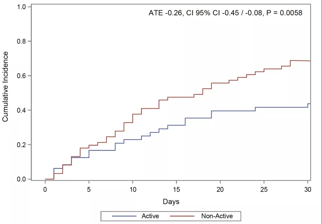 图1. 正在(蓝色)和非正在(红色)使用ADT的患者累积死亡率