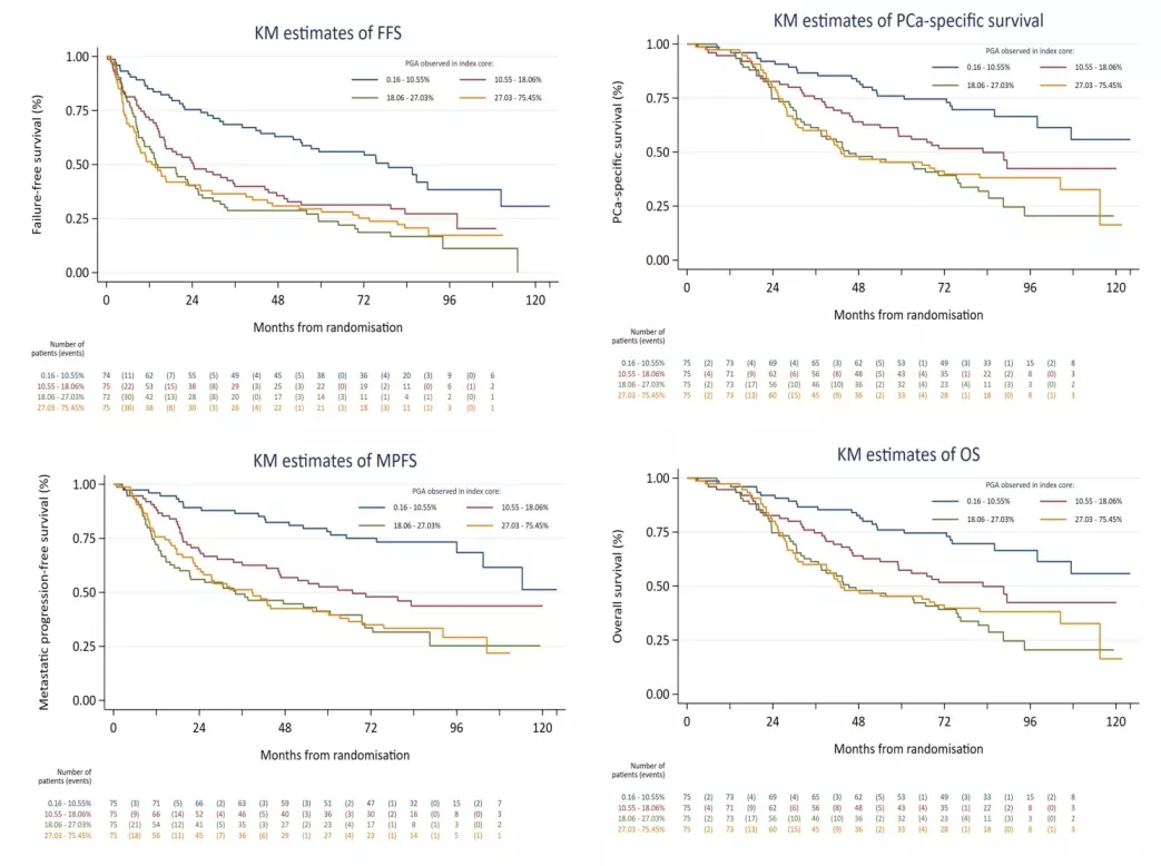 晚期HSPC患者行长程ADT治疗后,其临床病程异质性很大,化疗或新型内分泌治疗等强化治疗可改善治疗结局,但存在过度治疗的风险,尤其是在非转移性(M0)或转移性(M1)低瘤负荷的患者中。本研究对2005年至2016年间STAMPEDE研究中随机分配至标准ADT组的患者福尔马林固定石蜡包埋 (FFPE) 的穿刺活检标本进行了低深度全基因组测序 (lpWGS),成功分析了300例患者样本,以评估基因组改变百分比(PGA)的增加是否与更高的肿瘤负荷和更差的预后相关。