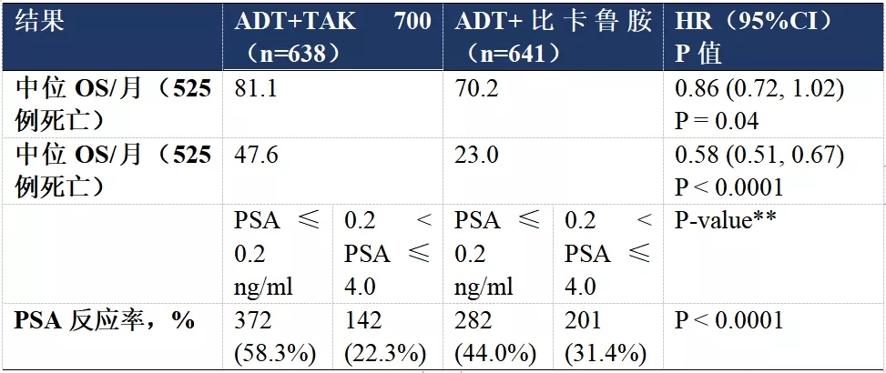 意向治疗分析集(ITT)共纳入1279例患者,中位随访4.9年后,TAK组的PFS和PSA反应明显优于比卡鲁胺组,但OS无明显改善(表1)。TAK组较比卡鲁胺组3/4级不良事件更多(43% vs. 14%),包括高血压(20% vs. 5%)和疲劳(5% vs. 2%)。5例TAK组患者和1例比卡鲁胺组患者发生5级AE。