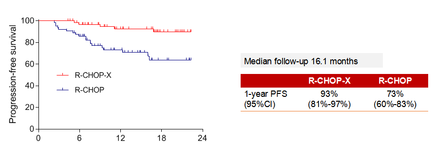 图1:R-CHOP+X方案能改善DLBCL患者的PFS及OS
