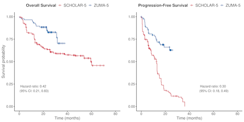 S-5中有143名患者,应用倾向评分权重后减少到85名患者,Z-5中有86名患者。Z-5和S-5的中位随访时间分别为23.3个月和26.2个月。成功匹配的变量(SMD<0.1)包括POD24,既往LOT的数量,复发与难治性,既往干细胞移植,最大的淋巴结大小,既往LOT的反应,上一次治疗后的时间和年龄。尽管相匹配,S-5队列在基线时有一个较高的ECOG的比例,1:0 (71.0% vs 40.7%)。