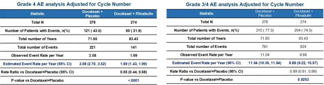 该方案有良好的安全性和耐受性。相比多西他赛对照组,研究组的4级AE发生率更低,每个周期的3/4级AE发生率也更低。