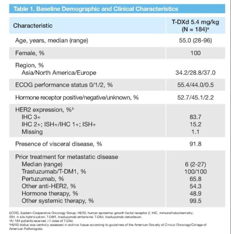 研究方法:接受T-DM1治疗或之后进展的MBC患者被纳入研究。在入选的253例患者中,184例接受了T-DXd 5.4 mg/kg(初步分析集)治疗。主要终点为ORR,其他终点包括DOR、PFS和OS。
