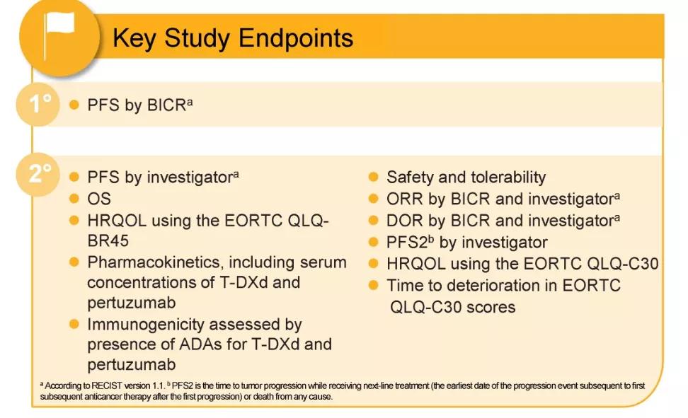 本研究包括3个治疗组:按1:1:1随机分组为A组(T-DXd +安慰剂)、B组(T-DXd +帕妥珠单抗)和C组(THP)。将根据既往治疗状态(初治vs复发)、激素受体状态(阳性vs阴性)和PIK3CA突变状态(检测到vs未检测到)对患者进行分层。mBC晚期患者(n=1134)之前没有接受化疗或HER2靶向治疗(mBC允许有1次内分泌治疗)。经盲法独立中央评估,主要终点为无进展生存期。次要终点包括研究者评估的无进展生存期、OS、ORR、DOR、PFS2、与健康相关的生活质量(QOL)、药代动力学、免疫原性和安全性。研究目前正在进行中。