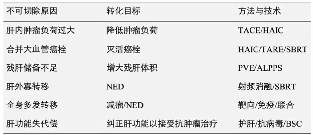 狭义上的“转化治疗”,是指对最初无法行手术切除的肝癌患者,通过一系列有效的治疗使其肿瘤退缩或降期,达到可以接受根治性手术(R0)切除。但随着手术、介入、放疗等局部治疗及系统治疗的发展,转化治疗的内涵也越来越丰富,除了达到R0切除以外,还包括无瘤状态(NED)、灭活癌栓等多种多样的转化目标。比如,对于肿瘤负荷较大的患者,可以通过TACE/HAIC实现降低肿瘤负荷;对于合并大血管癌栓的患者,可以通过HAIC/TARE/SBRT达到灭活癌栓;对于残肝不足的患者,可以通过PVE/ALPPS达到增大残肝体积;对于肝外寡转移的患者,可以通过射频消融/SBRT实现无瘤状态;对于全身多发转移的患者,可以联合靶向、免疫治疗实现减瘤或无瘤;对于肝功能失代偿的患者,可以通过抗病毒、护肝等治疗纠正肝功能。