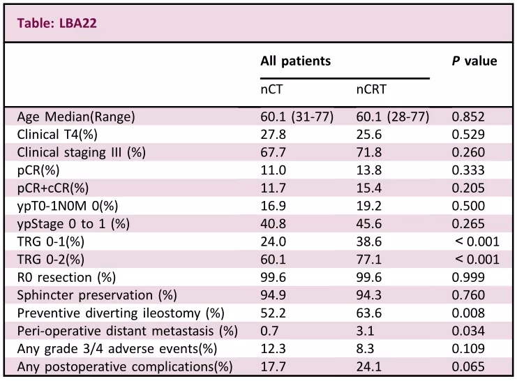 结论:与nCRT相比,nCT获得了相似的pCR和良好的降期率,围手术期远处转移和预防性结肠造口更少。在无MRF的LARC中,该方案可以作为CRT的潜在替代方案。需要长期随访来证实这些结果。(临床试验登记号:NCT02288195)