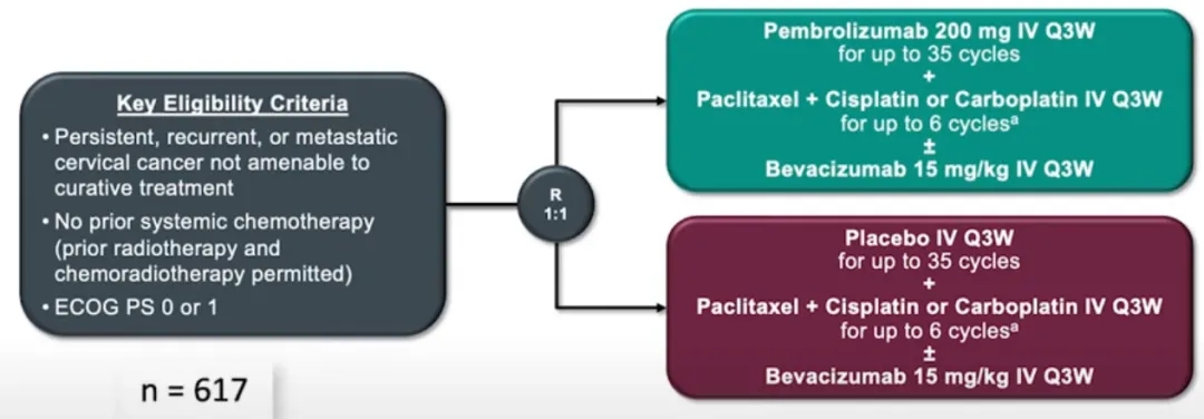 研究设计如图所示,KEYNOTE-826共纳入持续、复发或转移性宫颈癌患者617例,患者均为宫颈癌持续或初次复发,ECOG评分0-1分。对照组的方案为含铂化疗(紫杉醇联合顺铂或卡铂)±贝伐珠单抗,研究组的方案为帕博利珠单抗+含铂化疗±贝伐珠单抗,是否加用贝伐珠单抗由研究医生决定,患者按照1:1随机分组。