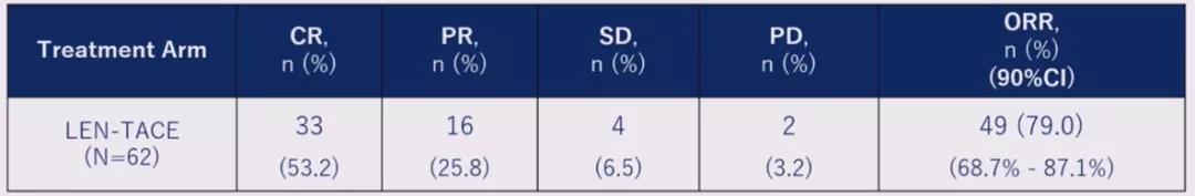 研究结果显示仑伐替尼与TACE联合治疗的ORR高达79%(90%CI:68.7%~87.1%),其中完全缓解(CR)率高达53.2%。而在既往报道的TACTICS研究中,单独TACE组ORR为61.8%,CR率为27.6%。该研究初步提示了仑伐替尼联合TACE在部分不可切除HCC患者中的巨大治疗价值和应用前景。