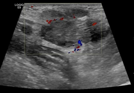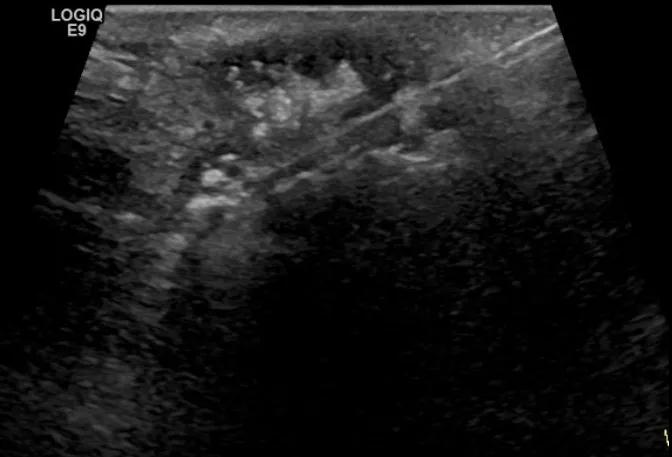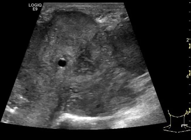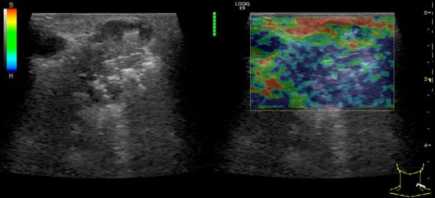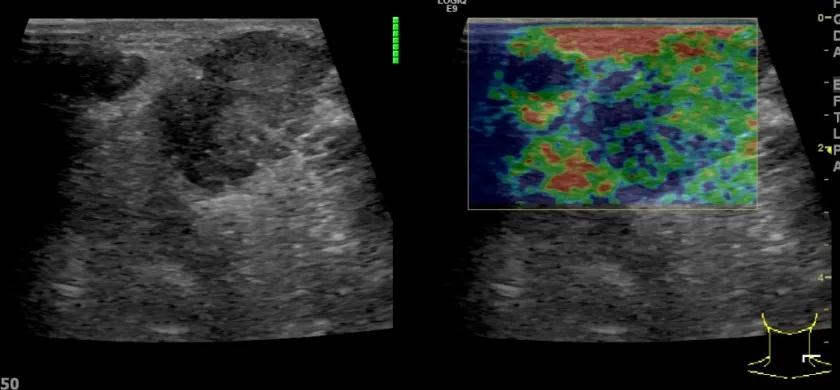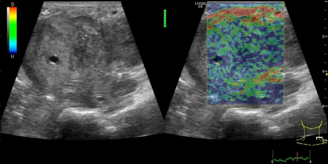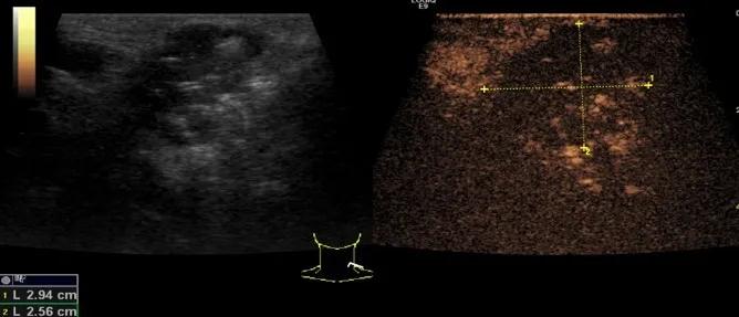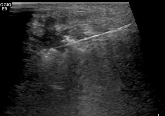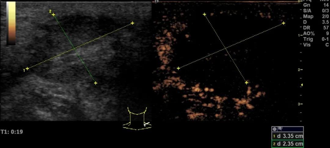 第二例是食管癌患者,术后半年余锁骨上固定淋巴结可触及肿大,疼痛非常明显,系统治疗后无缓解,患者希望通过局部处理缓解症状。造影显示强化信号明显,结节部分区域坏死,故主要针对强化区域从后向前的逐层的消融,皮下进行液体隔离减少烫伤。热消融后影像显示血流增强消失,弹性、硬度增高,一个月后复查显示充盈缺损,完全消融,疗效远超预期。