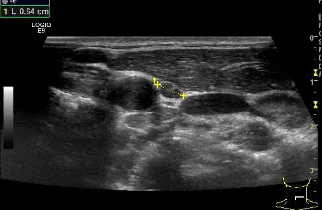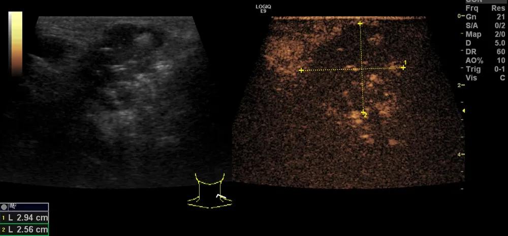 第三例是甲状腺癌患者,双侧甲状腺癌切除术后、碘治疗后一年余效果欠佳,超声显示左颈3区3枚低回声结节,穿刺示甲状腺乳头状癌转移。患者不愿意手术,希望采取局部治疗。对病灶进行液体隔离后采取热消融术,由于淋巴结较小,热消融一分钟左右完全灭活,术后增强影像显示没有脏器充填。