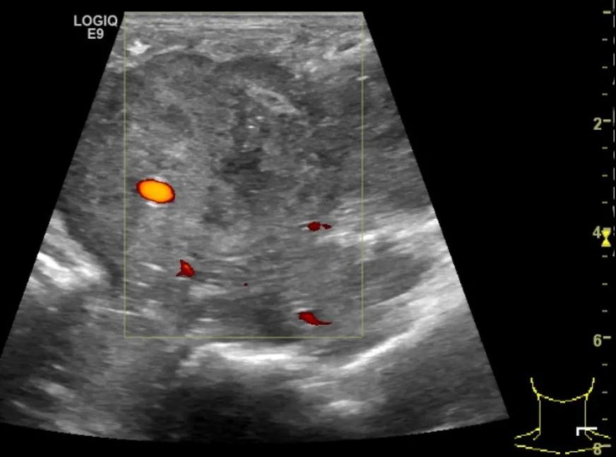 第四例是胸腺癌化妆包,术后、化疗之后淋巴结转移,肿块范围巨大,99mm*61mm,边界不清,呈浸润状,肿块包绕颈动脉,颈内静脉压闭,症状明显。由于患者放化疗也不敏感、血供非常丰富,于是采取多点姑息性消融。姑息性消融后未实现完全消融,病灶大片坏死,肿胀疼痛得到明显的缓解,后续患者未再来复查。