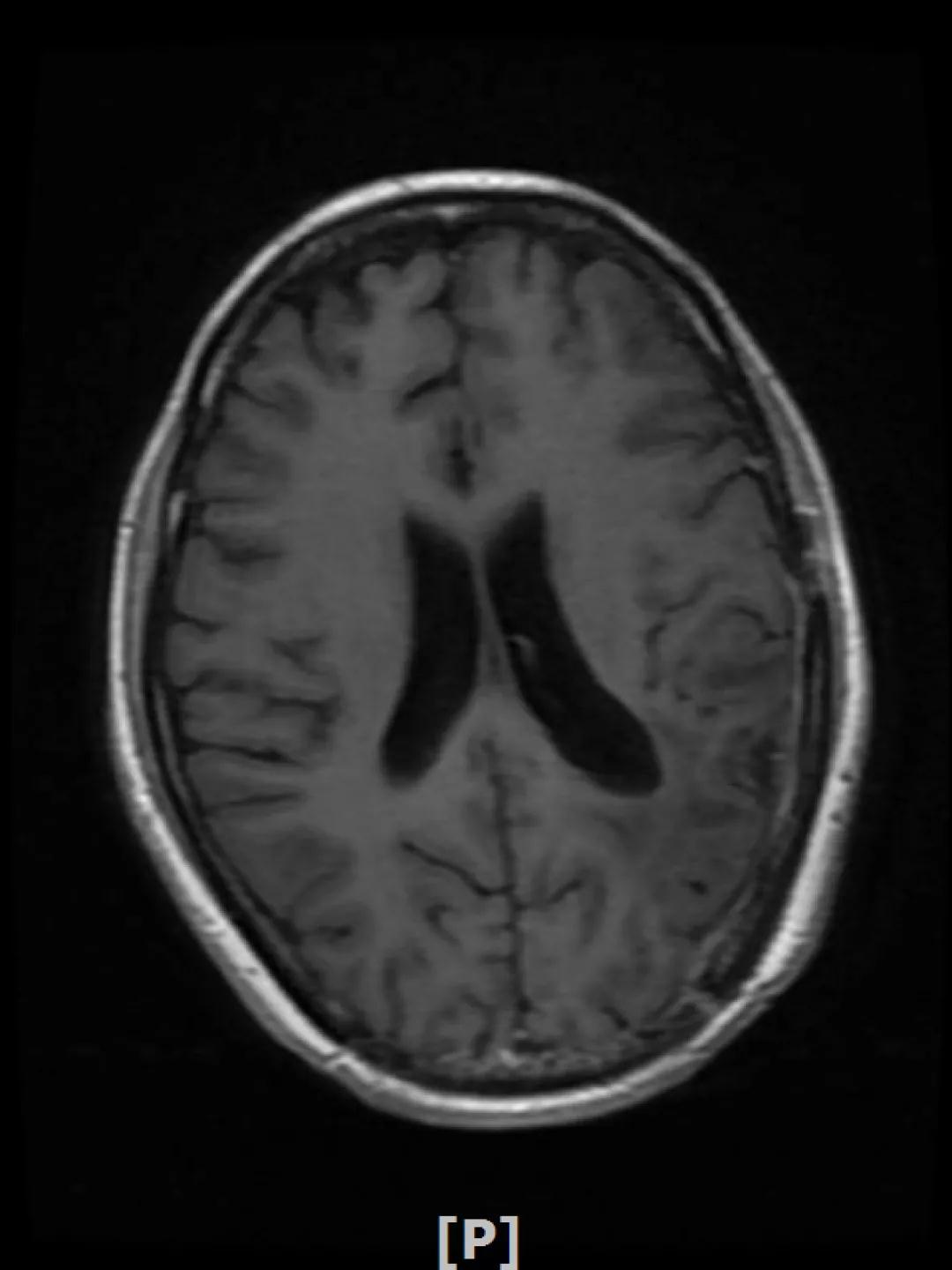 头颅增强MR:左侧顶枕叶见片状T1WI低信号、T2WI高信号影,增强后病灶边缘见局部斑片状强化改变,邻近脑膜轻度强化改变;右侧脑室三角区内侧见大小约8x14mm的结节影,T1WI低信号、T2WI等高信号,增强明显强化,灶周水肿明显;两侧脑室旁见片状异常信号,T1WI低信号,T2WI高信号,增强未见明显强化,余脑室、脑池、脑沟大小形态可,中线结构居中无移位