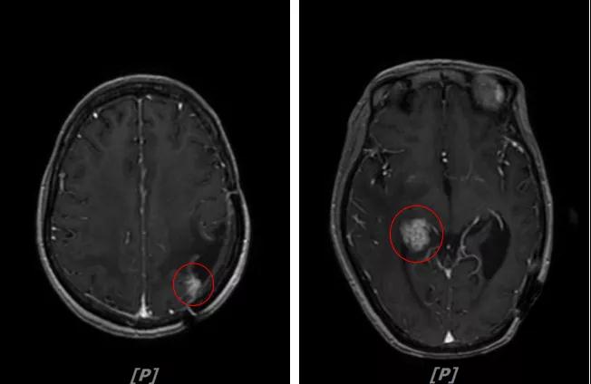 左顶叶强化结节、右侧颞叶-丘脑区结节影:较前片增大