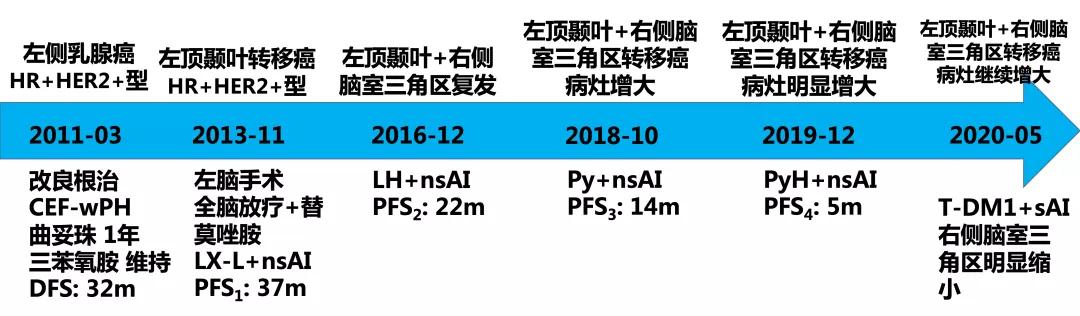 编者按:脑转移对于转移性乳腺癌(MBC )患者来说,往往是疾病的后期。MBC的中位生存期大约为3年,但当癌细胞转移至大脑时候,其生存期便显著缩短。研究提示,乳腺癌脑转移患者的中位生存期,以三阴性乳腺癌 (TNBC) 最短,仅仅6个月,HER-2阳性晚期乳腺癌患者,由于有了一系列有效的抗HER-2靶向单抗药物和小分子TKI药物,其中位生存期甚至达到21个月不等。特别是随着越来越多能穿过血脑屏障并靶向作用肿瘤的药物应用于临床,晚期乳腺癌患者的预后得到了长足改善。本文分享一例HER-2阳性、HR阳性(三阳性)乳腺癌脑转移患者病例,根据CSCO乳腺癌诊疗指南建议,这类三阳性复发转移乳腺癌患者,优先考虑抗HER-2靶向药物联合化疗的策略。HER-2靶向治疗联合化疗达到疾病稳定的患者,化疗停止后,应该选择抗HER-2靶向药物联合内分泌药物的维持治疗。该病例在接受以含抗HER-2靶向药物的标准治疗疾病进展后,选择抗HER-2联合内分泌治疗获得了较长的疾病缓解疗效。