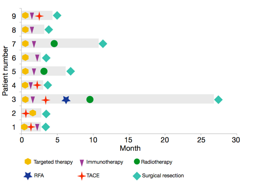 近期,该团队发表于HepatoBiliary Surg Nutr的一项研究,对83例有肝外转移的晚期HCC患者(CNLC分期IIIB)进行立体治疗,在38例拟转化手术组患者中,有9例病人成功接受转化手术,另有3例达到完全缓解(CR),不需要手术切除,总体无瘤转化率为31.6%;ORR和DCR分别达到了55%和100%,且大多数手术转化的患者(7/9,77.8%)接受了原研仑伐替尼(乐卫玛®)加PD-1抑制剂的方案。